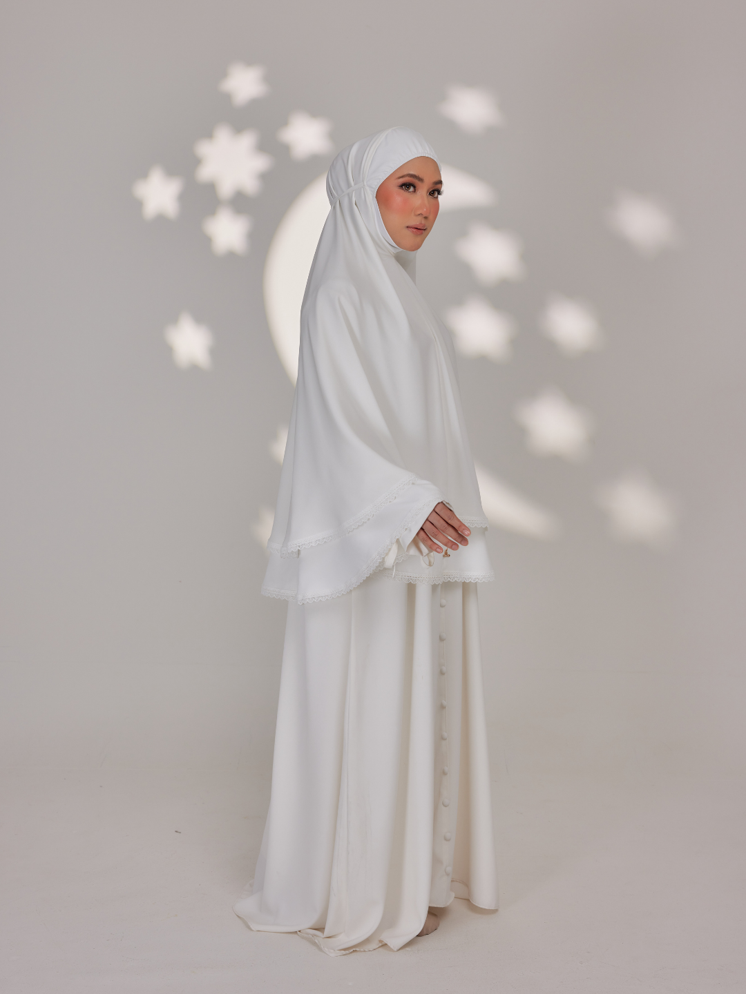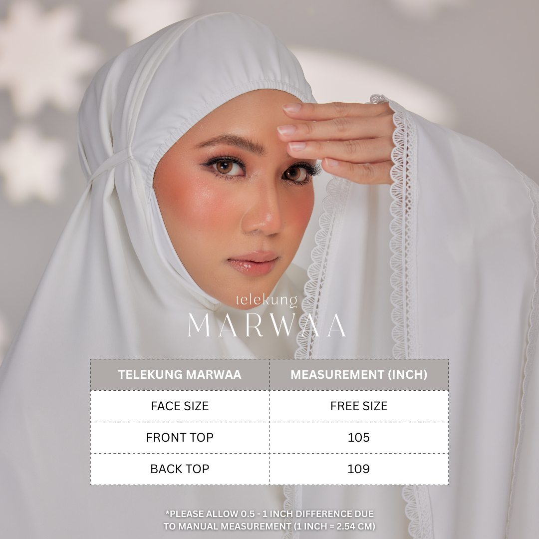 “Introducing our latest creation: Marwa Series mini telekung, crafted from luxurious premium nidha and chiffon silk for unparalleled comfort and quality. Embrace elegance with scalloped edge lace detailing, designed to elevate your prayer experience, it’s the epitome of sophistication and convenience. Experience prayer like never before with Marwaa Series.”